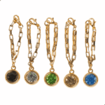 O conjunto de marcadores de taças Cristal, foi cuidadosamente desenhado para trazer o poder e a vibração dos cristais ao momento entre taças e vinhos. Estes marcadores representam o clássico, e refletem a elegância e a beleza das pedras lapidadas nas taças. As cores diferentes identificam e permitem a diferenciação entre as taças. Cada marcador é folheado a ouro 18K e recebe um segundo banho de verniz italiano para maior conservação e durabilidade.